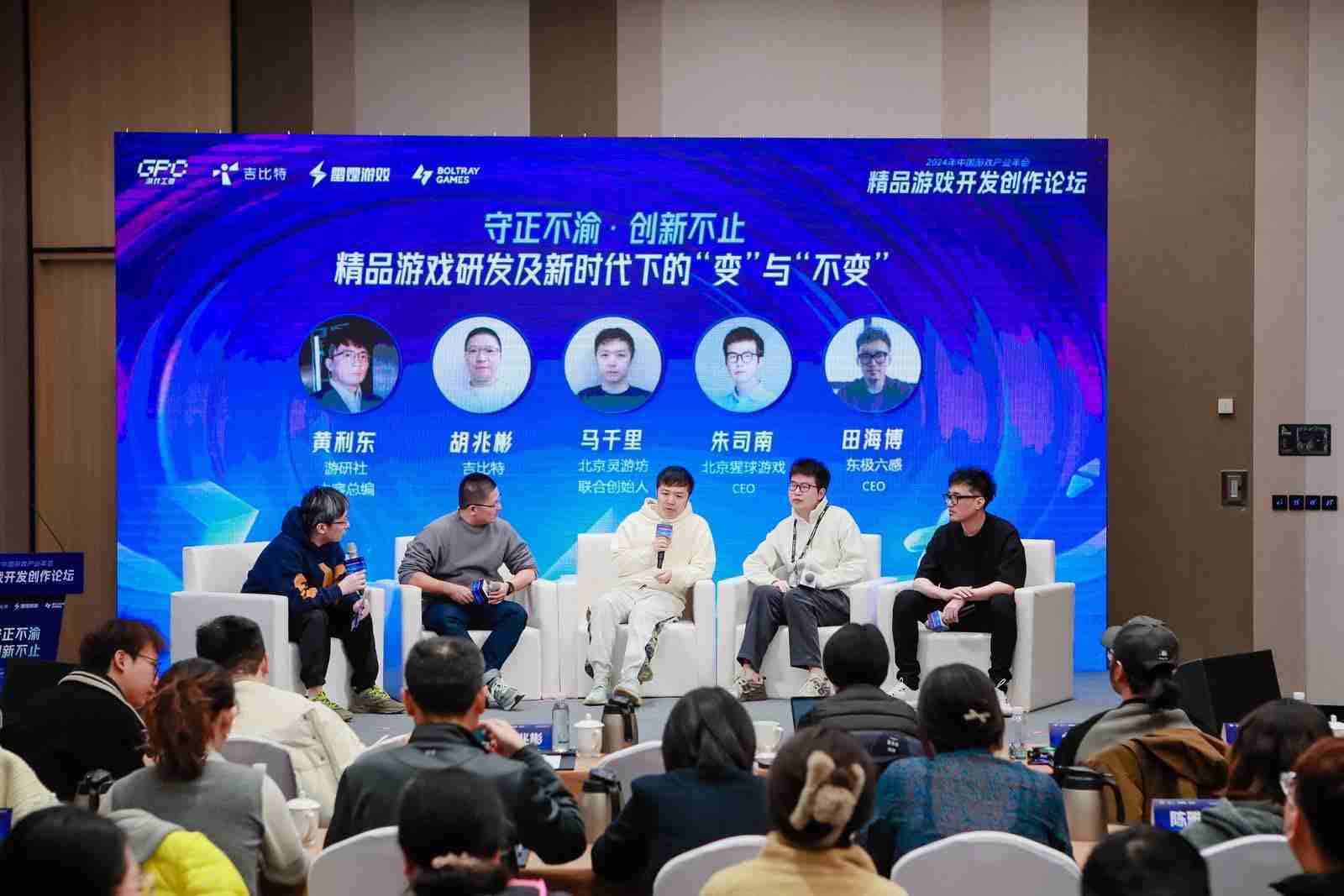 圆桌对话环节,,,在游研社内容总编黄利东的主持下,,,一竞技CTO胡兆彬、、、北京灵游坊联合创始人马千里、、北京猩球游戏CEO朱司南、、东极六感CEO田海博等四位嘉宾围绕“守正不渝、、、、创新不止——精品游戏研发及新时代下的‘变’与‘不变’”这一主题分享了各自在精品游戏开发理念及工程能力搭建方面的见解和经历,,,并就行业变化下游戏人需要坚守的理念等展开交流探讨。。。