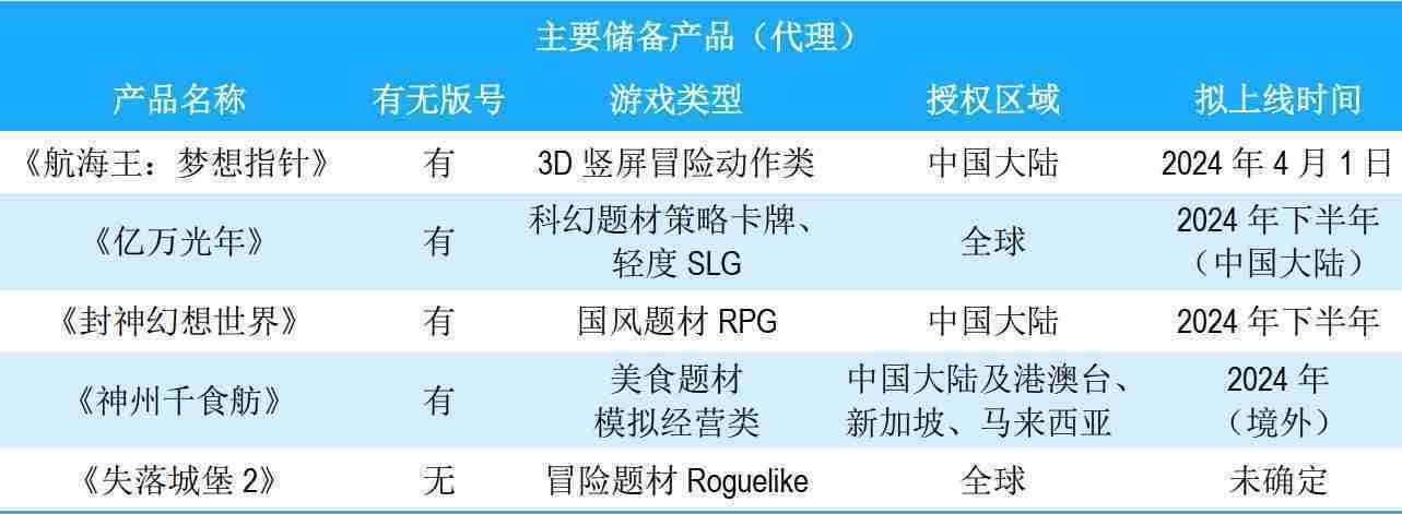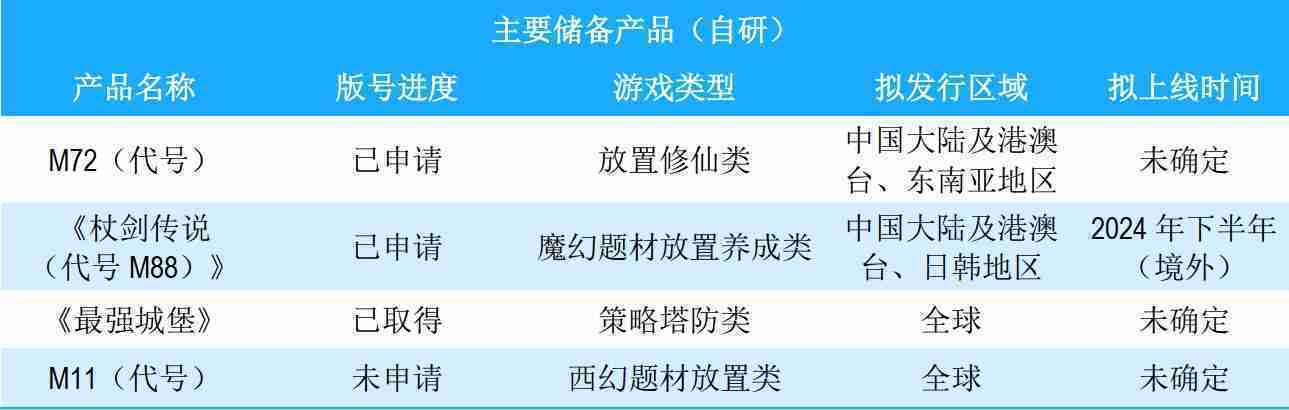 公司储备的多个自研、、、、代理产品都在有序推进当中,,,涵盖放置类、、、、策略类、、、、模拟经营类、、、RPG、、Roguelike等多元化游戏品类,,,,储备的主要自研和代理产品如下::
